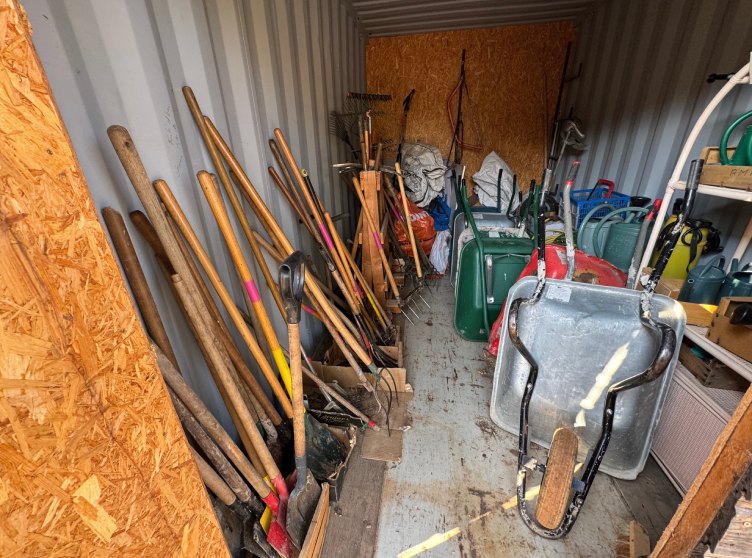 Vous trouverez essentiellement de gros outils de jardinage, arrosoirs et brouettes. Mais pas de petits outillages comme des sécateurs ni de tuyaux d’arrosage que vous devrez apportez.